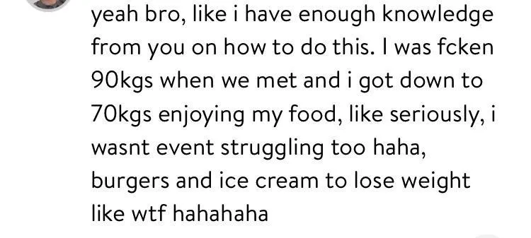 Yeah I know, it sounds too good to be true, but yes. Rohan used to be a proper fat cnt and made it his quest to ensure he eats like a fat cnt without becoming one. Now he teaches this to thousands of people. Food is not just food to us, we want to ensure we still celebrate wins, memories, weddings, birthdays, or even a cheeky weekend feed. We teach you how to do this and get fkn cracker results.